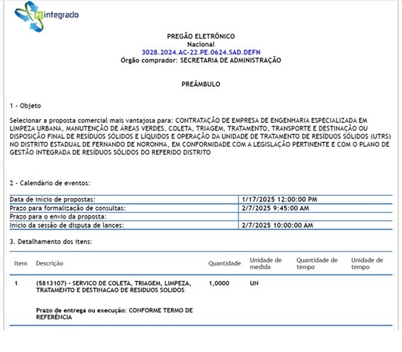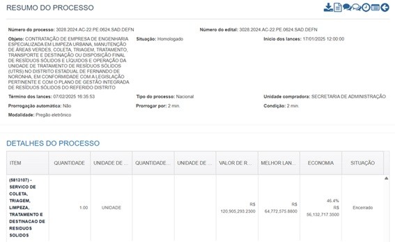 A AMBIPAR venceu o pregão eletrônico nº 0624/2024, assumindo as operações em 26 de agosto de 2025, substituindo a empresa Universo, que atuava há 20 anos na ilha.