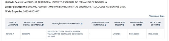 O contrato entre o Governo de Pernambuco e a empresa AMBIPAR Environmental Solutions – Soluções Ambientais Ltda. para a gestão de resíduos e limpeza urbana em Fernando de Noronha, firmado em 2025, tem por valor o montante de R$ 64.700.000,00 (sessenta e quatro milhões e setecentos mil reais). O contrato abrange um período de 60 meses (5 anos).