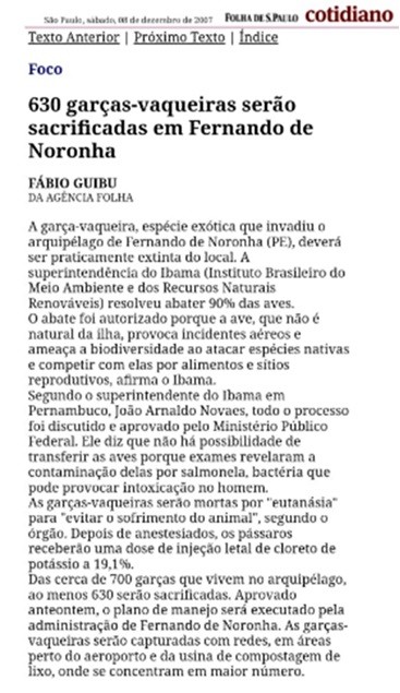 Matéria do jornal Folha de S. Paulo de dezembro de 2007, afirma que “as garças serão capturadas em áreas perto do aeroporto e da usina de compostagem do lixo de Fernando de Noronha, onde se concentram em maior número.