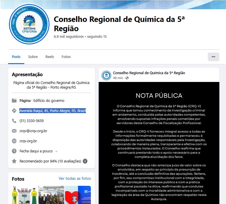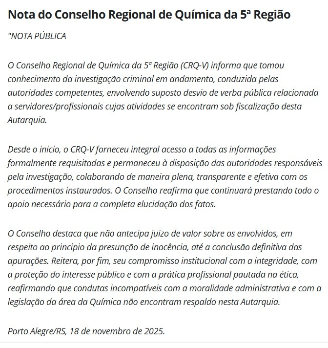 NOTA PÚBLICA. Fonte: CRQ-5a. Região